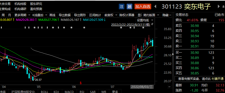 8月3日,奕东电子收盘价为30.91元/股,当日股价下跌3.74%,总市值72.21亿元。7月份,奕东电子股价上涨20.31%。