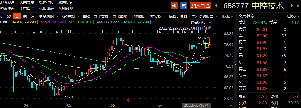 8月3日,中控技术收盘价为81.94元/股,当日股价上涨2.86%,总市值407亿元。7月以来,中控技术股价上涨9.73%。2022年二季度,中控技术被18家基金公司持有,占流通股比例1.84%。