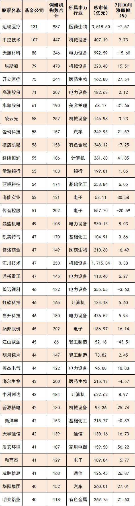 此外,天赐材料、埃斯顿、开立医疗和高测股份在7月份均被超过70家基金公司调研,水羊股份、凌云光、爱玛科技、横店东磁在7月份均被超过55家基金公司调研。