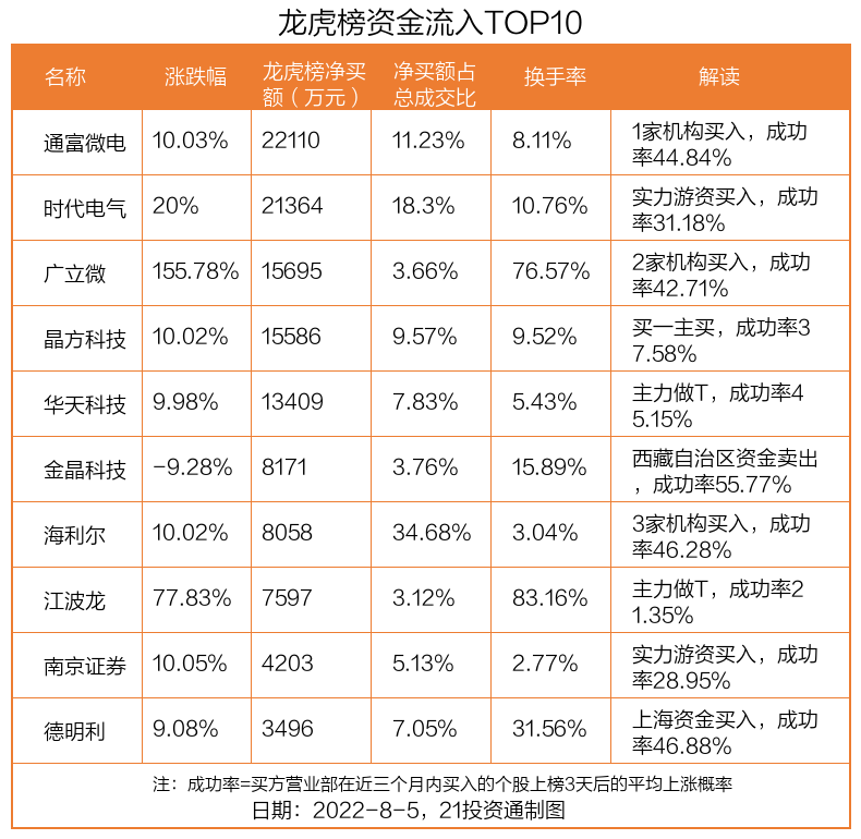 8月5日,上证指数上涨1.19%,深证成指上涨1.69%,创业板指上涨1.62%。盘后龙虎榜数据显示,共有56只个股因当日异动登上龙虎榜,资金净流入最多的是通富微电(002156.SZ),达2.21亿元。