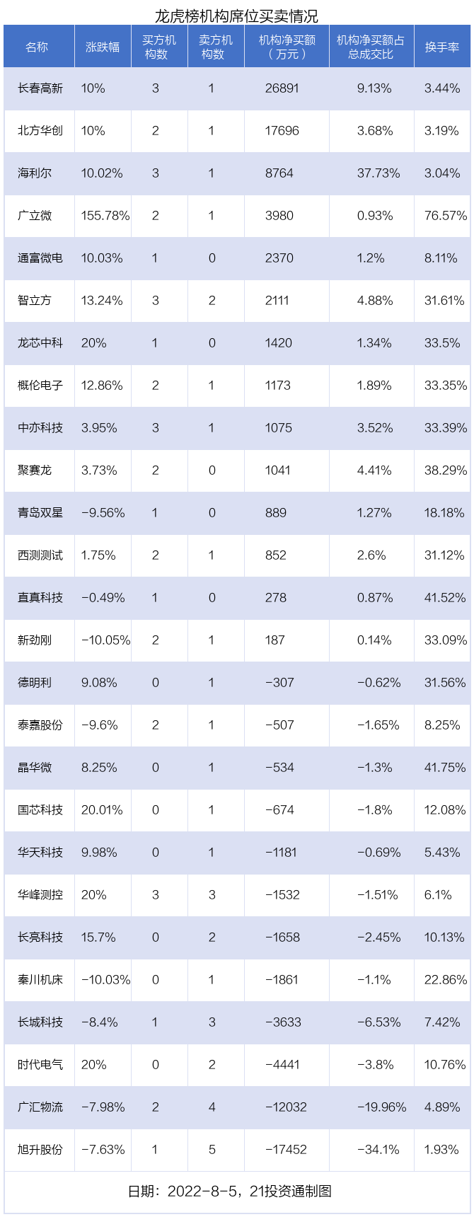 8月5日,26只个股龙虎榜出现了机构的身影,机构合计净买入2.29亿元。具体来看,机构净买入14股,净卖出12股。