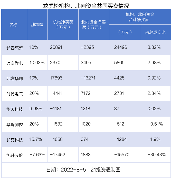 值得注意的是,机构和北向资金共同净买入了通富微电;在时代电气,旭升股份,华天科技,华峰测控,长亮科技,长春高新,北方华创上出现分歧,机构净卖出时代电气4440.88万元,北向资金净买入7171.56万元;机构净卖出旭升股份1.75亿元,北向资金净买入1882.71万元;机构净卖出华天科技1181.04万元,北向资金净买入1218.34万元;机构净卖出华峰测控1531.54万元,北向资金净买入1019.95万元;机构净卖出长亮科技1657.71万元,北向资金净买入373.71万元;机构净买入长春高新2.69亿元,北向资金净卖出2395.35万元;机构净买入北方华创1.77亿元,北向资金净卖出1.33亿元。