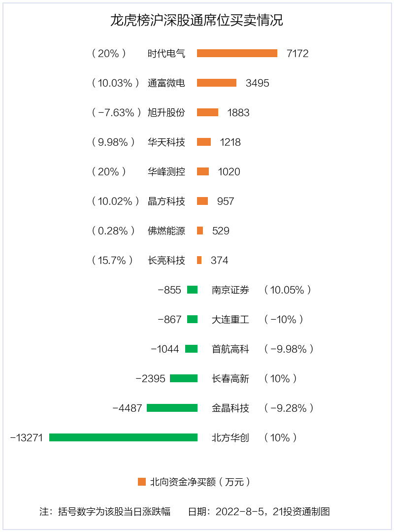 8月5日,北向资金参与龙虎榜中的个股共有14只,合计净卖出6270.68万元。其中沪股通净买入4 股,净卖出2 股,合计净买入5690万元;深股通净买入4 股,净卖出4 股,合计净卖出1.2亿元。