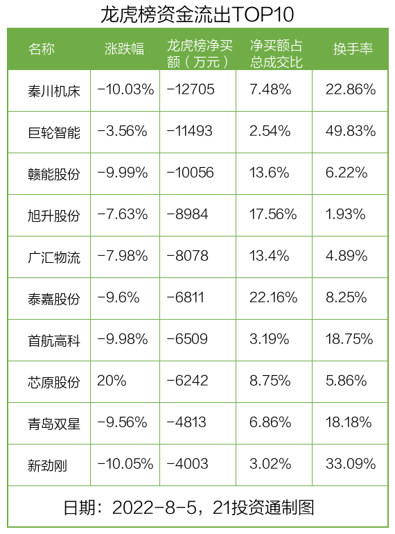 而龙虎榜中资金净流出最多的是秦川机床(000837.SZ),被净卖出为1.27亿元,占总成交金额的7.48%。秦川机床收盘下跌10.03%,换手率为22.86%。