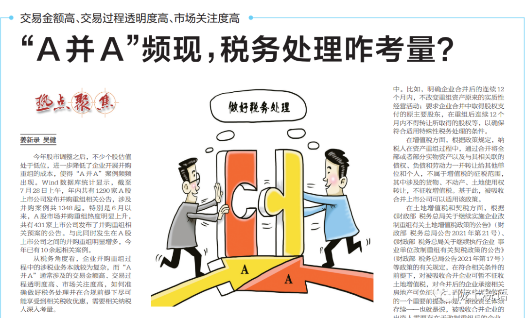 从税务角度看,企业并购重组过程中的涉税业务本就较为复杂,而“A并A”通常涉及的交易金额高、交易过程透明度高、市场关注度高,如何准确做好税务处理并在合规前提下尽可能享受到相关税收优惠,需要相关纳税人深入考量。