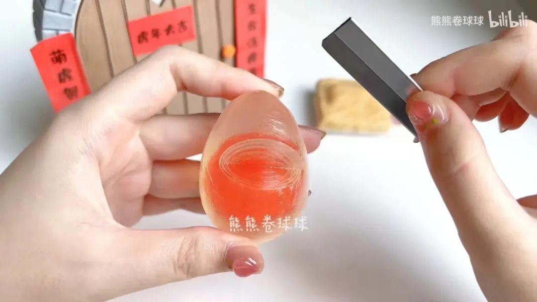在熊熊卷球球制作的《挤痘模拟器》视频里,有一个光滑的、金黄色的大球,轻轻切开一个小口,藏在里面的水宝宝一股脑冲了出来。而在另一个《咸鸭蛋胶带球》的视频中,熊熊做了一个晶莹剔透的鸭蛋,轻轻割开透明的“蛋清”,里面橙色的鸭蛋黄逼真得像是要流油。