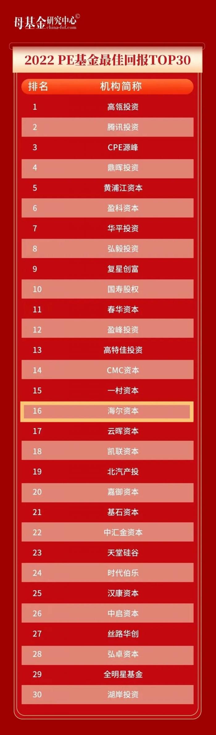 7月31日,母基金研究中心正式发布2022年中榜单。凭借专业的投资能力和洞察能力,海尔资本投中诸多优秀项目,荣幸在业界收获认可,在此次榜单中上榜“2022 PE基金最佳回报TOP30”,位列16名。