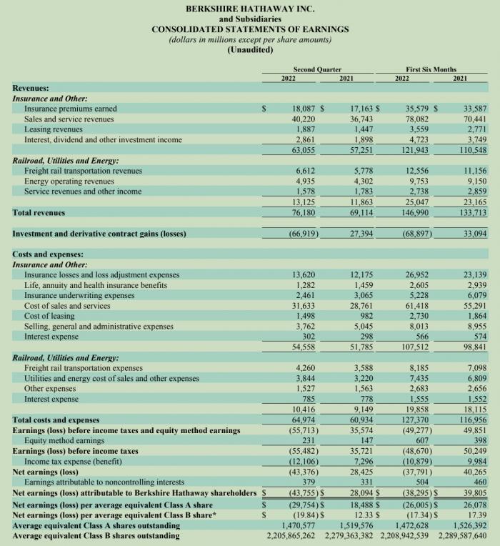 需要注意的是,伯克希尔净利剧烈波动是因为投资和衍生品的收益和损失也需要计入财报,第二季度投资和衍生品净亏损530.38亿美元。这一点也被巴菲特多次吐槽,股神称投资和衍生品的收益和损失对于理解财报和评估经济表现并没有真正意义。