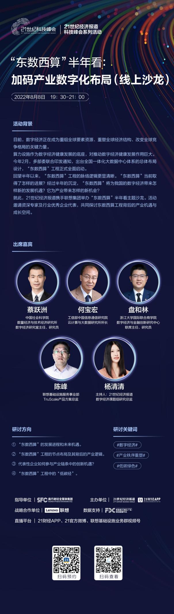 8月8日消息,《21世纪经济报道》科技峰会系列活动——“东数西算”半年看:加码产业数字化布局主题沙龙今晚来袭!直播时间确定为8月8日(周一)19:30-21:00,欢迎关注!