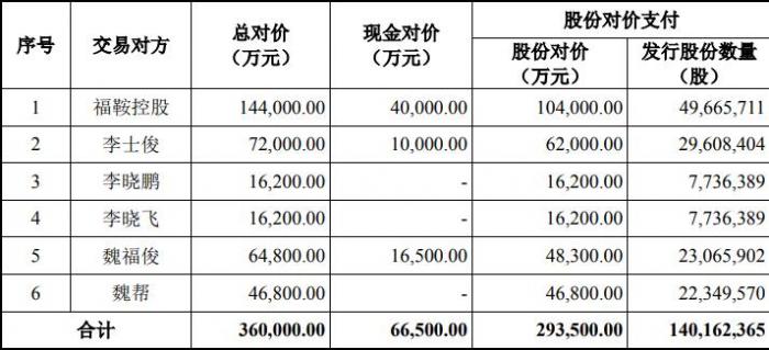 其中,福鞍股份将获得4亿元现金,李士俊获得1亿元现金对价。