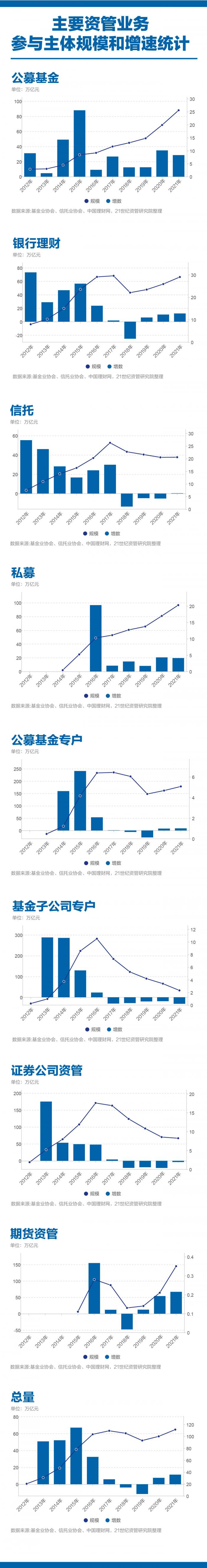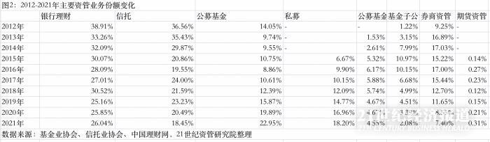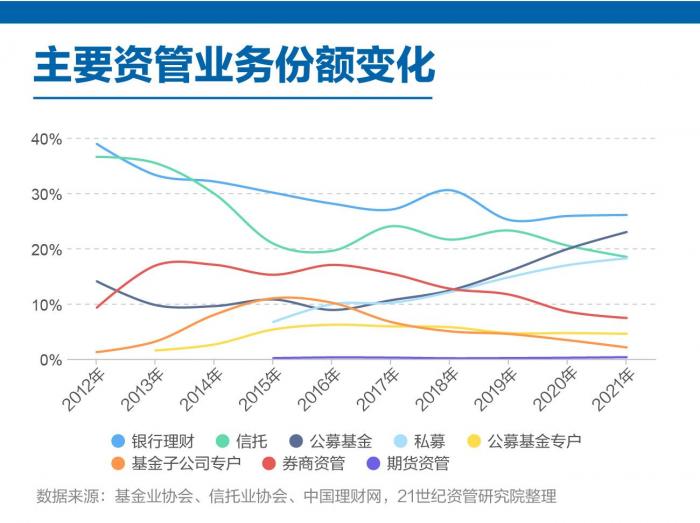 截至2021年底,各资管业务份额占比如下:银行理财占比26.04%,公募基金占比22.95%,信托资金占比18.45%,私募资管占比18.20%,证券公司资管占比7.40%,公募基金专户占比4.55%,基金子公司专户占比2.08%,期货资管占比0.31%。
