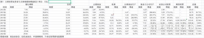 2021年资管总体规模来看为111.36亿元(其中有银信合作、银证合作等重复计算未剔除),这是资管新规出台以来,继2020年之后第二次出现正增长,并且第一次增幅达到两位数。