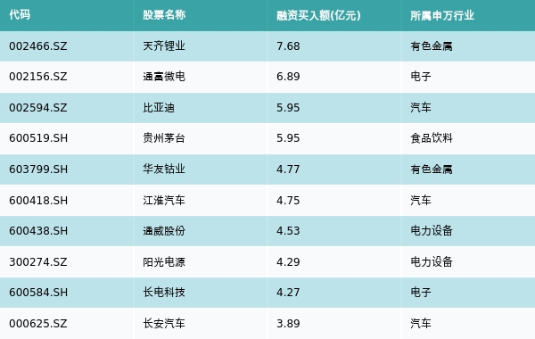 8月10日两市共有2389只个股有融资资金买入,其中天齐锂业、通富微电、比亚迪排名前三,买入金额分别7.68亿元、6.89亿元、5.95亿元。融资买入额前10个股详情见下表: