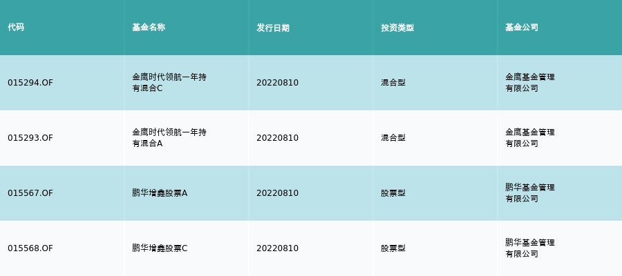 8月10日有4只新基金发行,分别为:金鹰时代领航一年持有混合C、金鹰时代领航一年持有混合A、鹏华增鑫股票A、鹏华增鑫股票C,详情见下表: