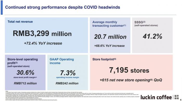 财务数据显示,二季度,瑞幸实现总净收入32.99亿元,同比增长72.4%;自营门店利润率30.6%,同店销售增长率为41.2%;净增门店数615家;月均交易客户数达到2070万,同比增长68.6%。