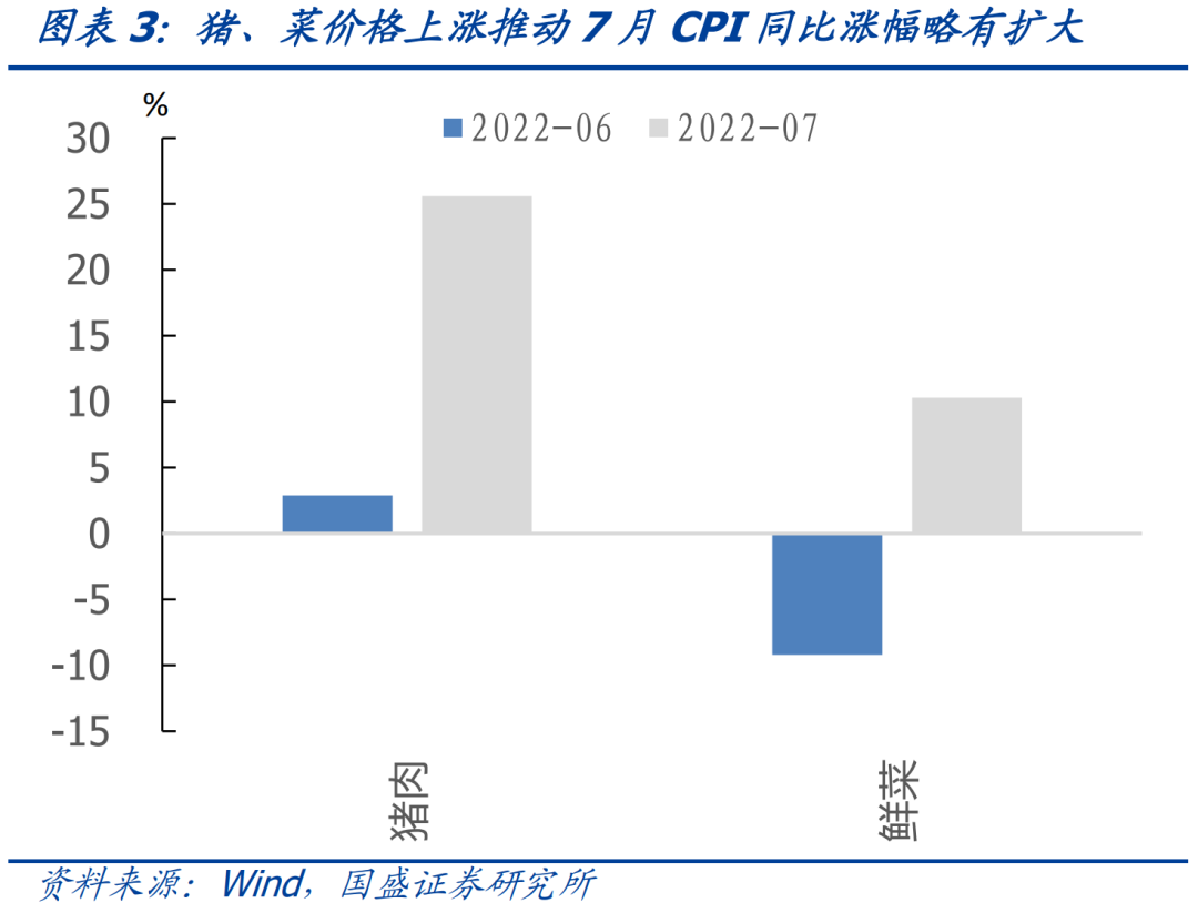 猪、菜等食品价格上涨推动7月CPI同比涨幅略有扩大。7月份 CPI同比增长2.7%,涨幅比上月扩大0.2%,翘尾因素影响0.9个百分点,较上月下降0.3%,而新涨价较上月大幅提升0.5个百分点,共影响1.8个百分点,而这主要是受7月猪、菜等食品价格上涨驱动。具体分项上,7月猪肉价格环比上涨25.6%,受7月高温天气影响,鲜菜价格由上月下降9.2%转为上涨10.3%。