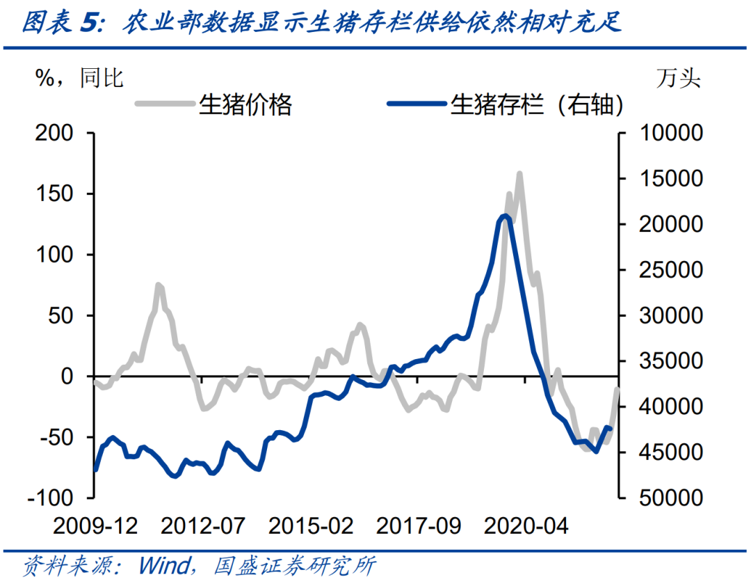 但高频数据显示7月上中旬以来猪价已震荡下行,供需上不具备持续上涨基础。6月下旬以来受前期生猪产能去化效应逐步显现、部分养殖户压栏惜售和消费需求恢复等因素影响,猪肉价格大幅上涨,7月环比上涨25.6%,同比由上月下降6.0%转为上涨20.2%。但高频数据显示7月上中旬以来猪价已持续震荡回落,猪肉平均批发价已从7月15日的30.51元/公斤下滑至8月9日的28.89元/公斤(下跌5.3%),外三元毛猪收购价也从7月10日的23.49元/公斤下滑至8月9日的21.37元/公斤(下跌9.0%)。后续供需上猪价并不具备持续上涨基础,从农业部提供供给数据来看,猪肉供给并未显著短缺。截止今年4月份,全国生猪存栏量为4.2亿头,全国能繁母猪为4177万头,而19年最低时两者分别仅有1.9亿头和1924万头,当前存栏量在历史上处于中游水平,因而能够支撑相对稳定的出栏量,夏季本身也是猪肉需求淡季,叠加国内需求不足,后续猪肉供需相对稳定,并不支持猪价持续大幅上升。