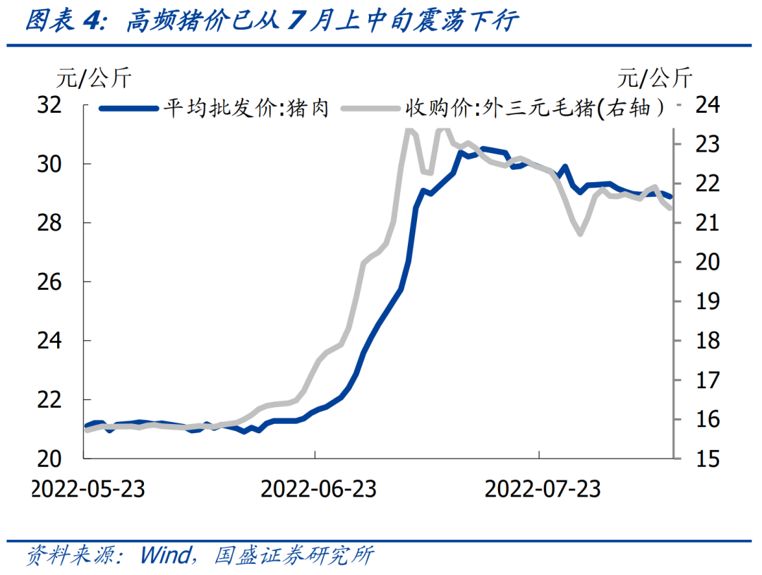 但高频数据显示7月上中旬以来猪价已震荡下行,供需上也不具备持续上涨基础。6月下旬以来受前期生猪产能去化效应逐步显现、部分养殖户压栏惜售和消费需求恢复等因素影响,猪肉价格大幅上涨,7月环比上涨25.6%,同比由上月下降6.0%转为上涨20.2%。但高频数据显示7月上中旬以来猪价已持续震荡回落,猪肉平均批发价已从7月15日的30.51元/公斤下滑至8月9日的28.89元/公斤(下跌5.3%),外三元毛猪收购价也从7月10日的23.49元/公斤下滑至8月9日的21.37元/公斤(下跌9.0%)。