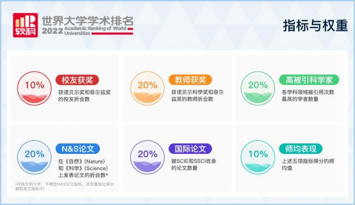 据介绍,软科世界大学学术排名的评价方法全部采用国际可比的客观指标和第三方数据,包括获诺贝尔奖和菲尔兹奖的校友和教师数、科睿唯安高被引科学家数、在《自然》(Nature)和《科学》(Science)上发表的论文数、被Web of Science科学引文索引(SCIE)和社会科学引文索引(SSCI)收录的论文数、师均学术表现等。