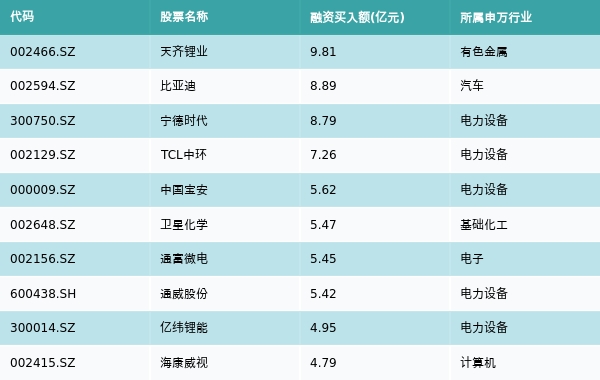 8月15日两市共有2393只个股有融资资金买入,其中天齐锂业、比亚迪、宁德时代排名前三,买入金额分别9.81亿元、8.89亿元、8.79亿元。融资买入额前10个股详情见下表: