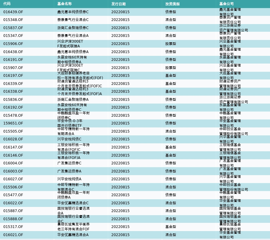 8月15日,有29只新基金发行,分别为:鑫元惠丰纯债债券C、泰康景气行业混合C、浙商汇金聚瑞债券C、泰康景气行业混合A、兴业沪深300ETF发起式联接A、鑫元惠丰纯债债券A、永赢安悦60天持有期中短债债券A、兴业沪深300ETF发起式联接C、大成颐享稳健养老目标一年持有混合发起式(FOF)、财通资管通达稳利3个月定开债券发起式(FOF)C、财通资管通达稳利3个月定开债券发起式(FOF)A、浙商汇金聚瑞债券A、永赢安悦60天持有期中短债债券C、中融融盛双盈一年封闭债券C、平安中债-0-3年国开行债券ETF、中邮专精特新一年持有期混合A、兴华安悦纯债C、工银安裕积极一年持有混合(FOF)C、工银安裕积极一年持有混合(FOF)A、广发集远债券C、广发集远债券A、兴华安悦纯债A、中邮专精特新一年持有期混合C、中融融盛双盈一年封闭债券A、华安优嘉精选混合C、国投瑞银行业睿选混合A、国投瑞银行业睿选混合C、景顺长城隽发平衡养老三年持有混合FOF、华安优嘉精选混合A,详情见下表: