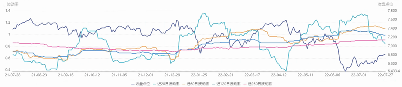 区间内,恒生指数涨跌幅峰度为1.195,涨跌幅统计数据呈现低峰瘦尾的特征。涨跌幅偏度为-0.671,数据分布呈现轻微左偏。总体而言,恒生指数涨跌幅分布较为集中,出现极端值的可能性较小。同时,相比于2021全年,2022年收益率的波动会更大,整体风险在升高。