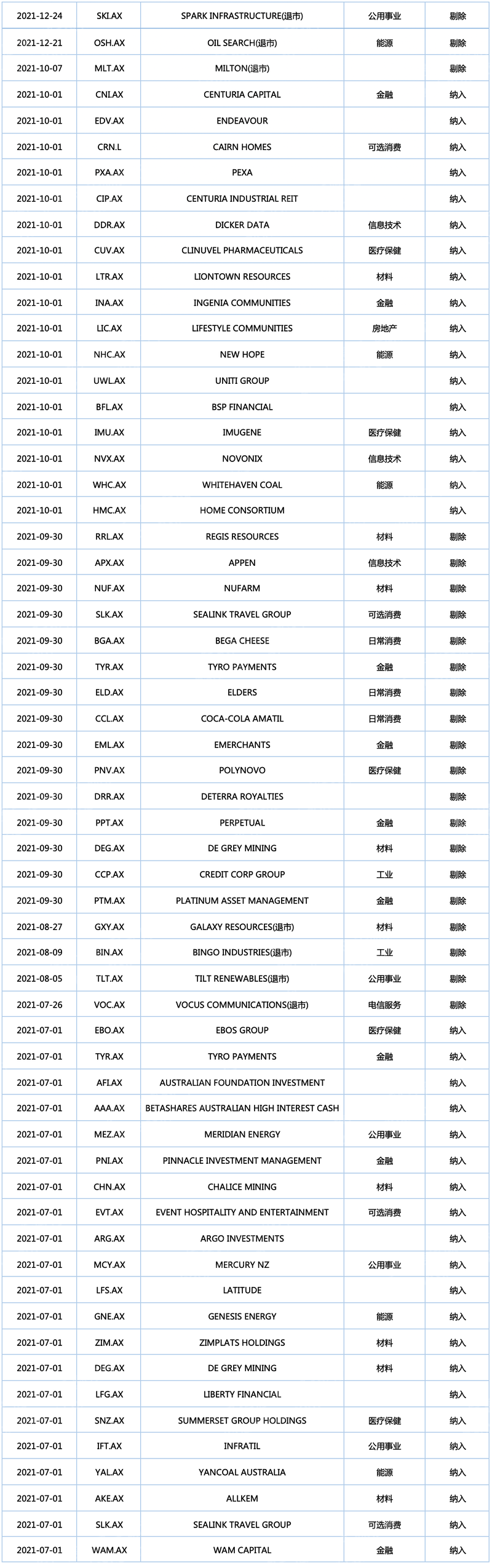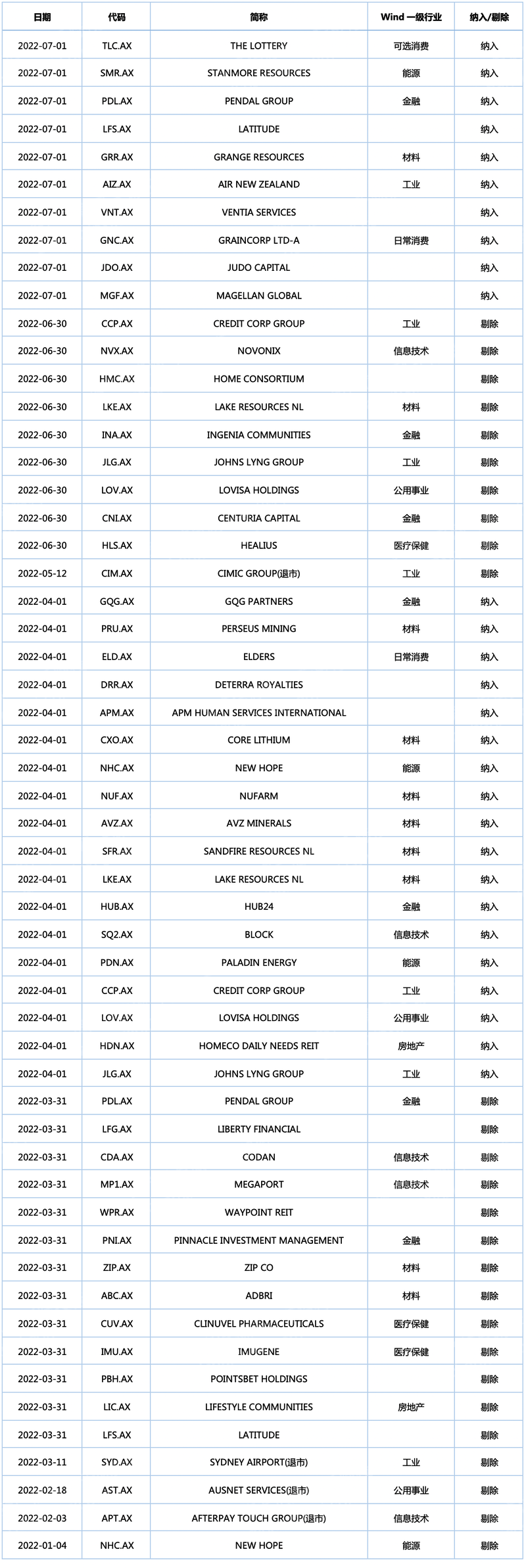频率:S&P/ASX 20、S&P/ASX 50、S&P/ASX 100、S&P/ASX 200、S&P/ASX All Australian 50和S&P/ASX All Australian 200指数成分股每季度进行一次再平衡,以确保足够的市场资本化和流动性。季度再平衡变化在3月、6月、9月和12月的第三个星期五收市后生效。
