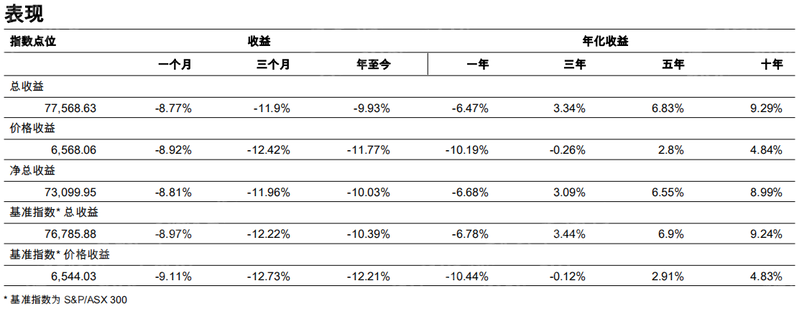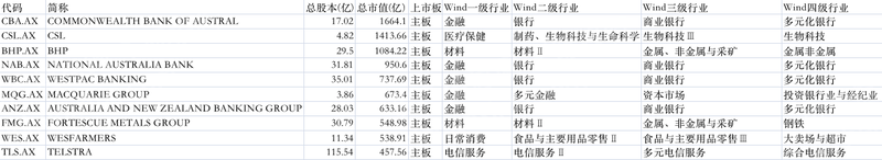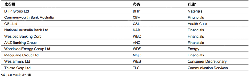 澳大利亚标普指数为流通市值加权指数,指数占比前10的公司分别为:BHP Group Ltd、Commonwealth Bank Australia、CSL Ltd、National Australia Bank Ltd、Weatpac Banking Corp、ANZ Banking Group、Woodside Energy Group Ltd、Macquarie Group Ltd、Westfarmers Ltd、Telstra Corp Ltd。