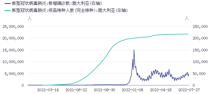 澳大利亚在发达国家中有相对严格的防控措施与95%的疫苗完全接种率,加上疫情暴发前后GDP相对平稳的表现,澳大利亚似乎可以迎来“防疫经济双成功”。但到了今年年初,奥密克戎病毒的传播不仅令该国2022年以来每日保持新增感染病例过万的记录,疫情之下全球供应链紧张也使该国制造业与高科技产业均受到明显影响。