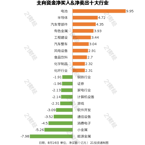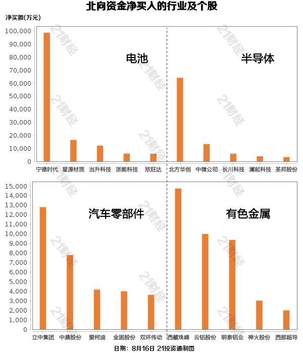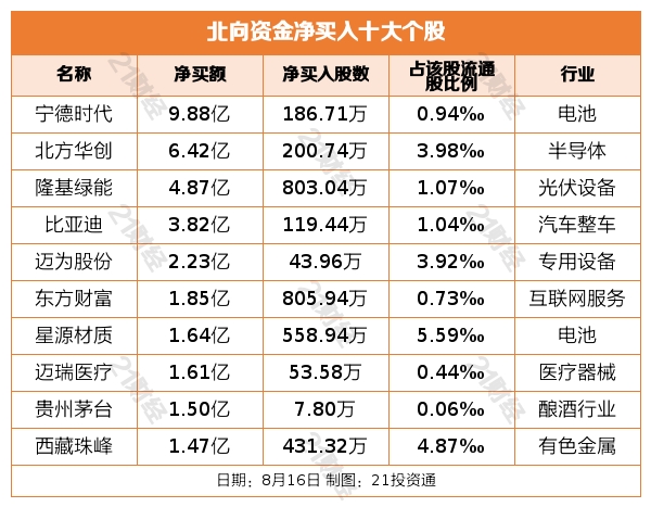据21投资通(微信号ID:touzit21)智能监测,8月16日,北向资金净买入8.67亿元,其中沪股通净卖出1.59亿元,深股通净买入10.26亿元。