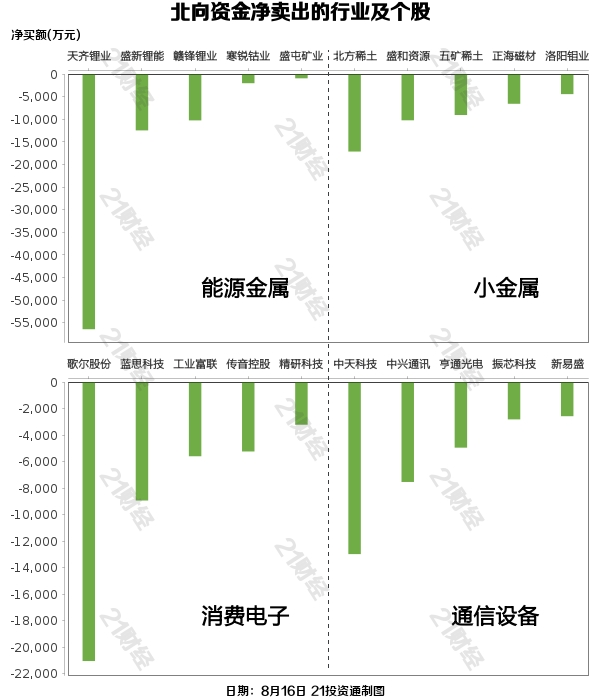 北向资金减持了54个行业,其中能源金属最多,净卖出金额达7.98亿元,其次是小金属行业,净卖出5.26亿元。