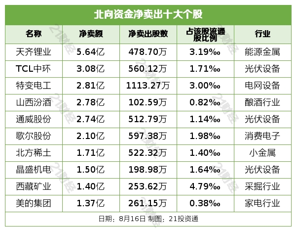 北向资金净卖出天齐锂业(002466.SZ)、TCL中环(002129.SZ)、特变电工(600089.SH)、山西汾酒(600809.SH)、通威股份(600438.SH)居前,其中,天齐锂业被净卖出5.64亿元,TCL中环被净卖出3.08亿元,特变电工被净卖出2.81亿元,山西汾酒被净卖出2.78亿元,通威股份被净卖出2.74亿元。