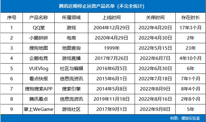 事实上,今年以来,腾讯“断舍离”的速度明显加快,据螺旋实验室不完全统计,截止到今年8月,已经近10款知名产品或应用相继被腾讯官宣放弃,彻底成为历史。