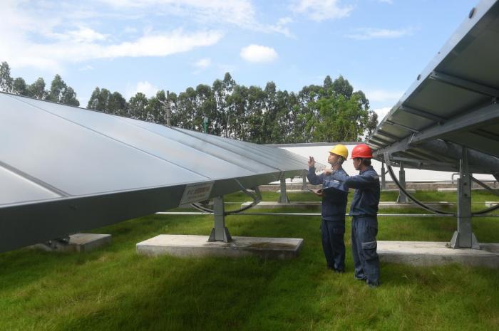 (工作人员进行南沙“多位一体”微能源网示范工程太阳能集热系统巡检工作。图片:广州供电局)