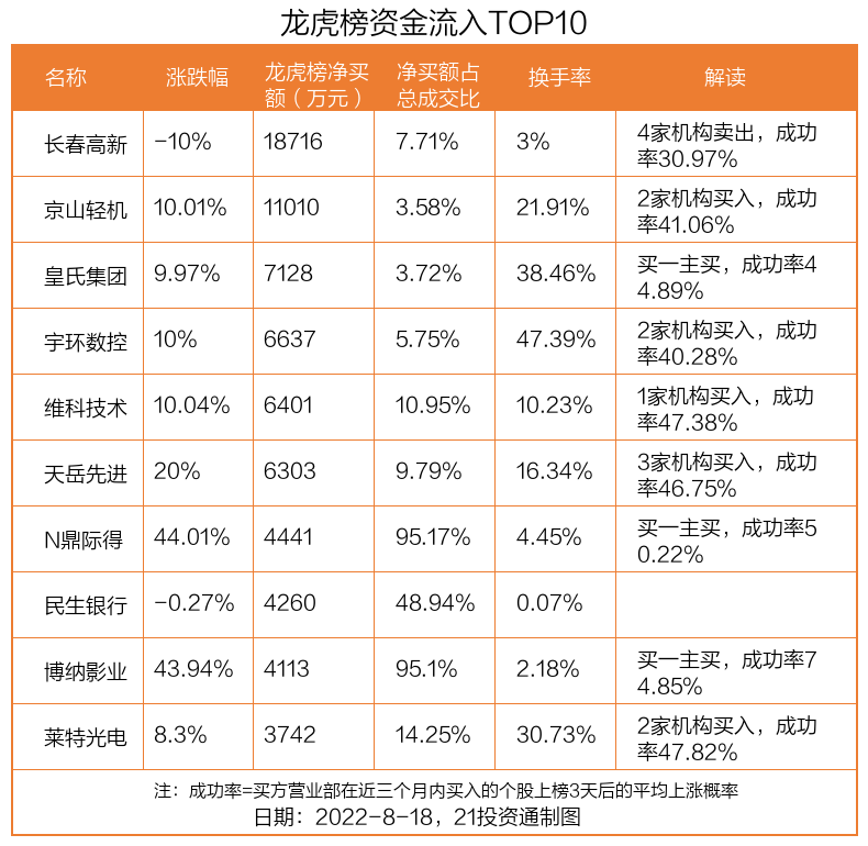 51只上榜的龙虎榜个股中,30只个股被净买入,21只个股被净卖出。其中,资金净买入最多的是长春高新,达1.87亿元,占总成交金额的7.71%。
