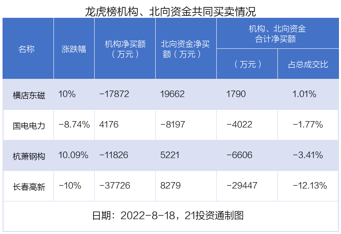 值得注意的是,机构和北向资金在横店东磁,长春高新,杭萧钢构,国电电力上出现分歧,机构净卖出横店东磁1.79亿元,北向资金净买入1.97亿元;机构净卖出长春高新3.77亿元,北向资金净买入8278.9万元;机构净卖出杭萧钢构1.18亿元,北向资金净买入5220.65万元;机构净买入国电电力4175.54万元,北向资金净卖出8197.2万元。