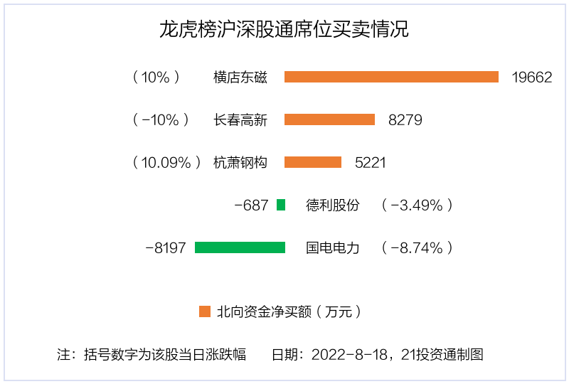 北向资金净买入金额最多的是横店东磁(002056.SZ),净买入1.97亿元,占总成交金额的11.11%。净卖出金额最多的是国电电力(600795.SH),为8197.2万元,占总成交金额的3.61%,当日收盘下跌8.74%,换手率为3.32%。