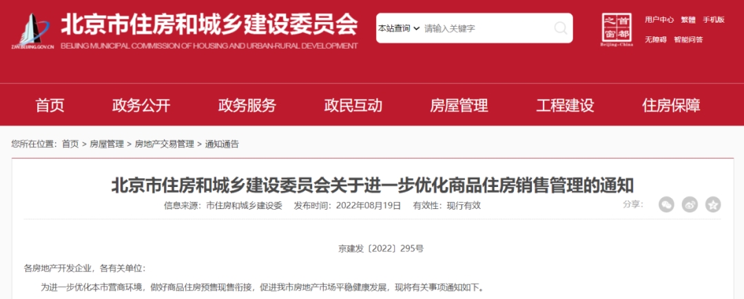 8月19日,北京住建委发布《关于进一步优化商品住房销售管理的通知》,其中提出,商品住房项目预售许可截止日期为预售方案中确定的房屋交付日期,预售合同中约定的房屋交付日期应与预售方案中确定的交付日期一致。