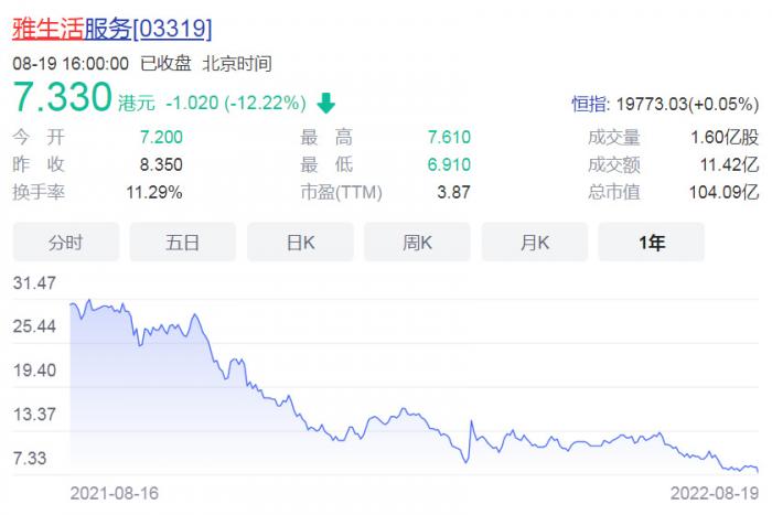 如今母公司艰难,波及雅生活,8月19日收盘,其市值仅104亿港元。