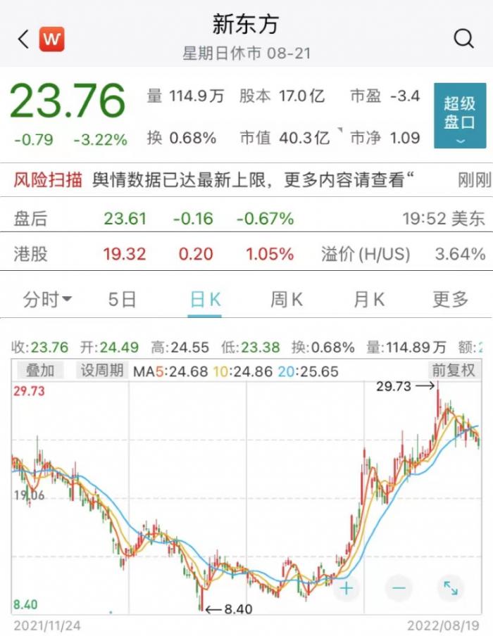 股票回购方面,2022年7月26日,新东方董事会授权一项针对新东方普通股的股份回购计划,回购金额最多为4亿美元,期限为2022年7月28日至2023年5月31日。