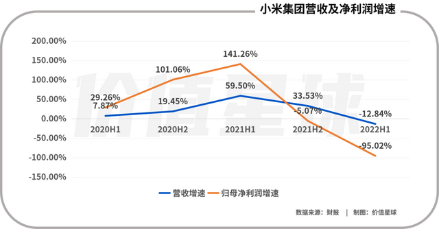 整个上半年,小米集团营收1435亿元,同比下降12.84%,净利润7.988亿元,同比下降95.02%。