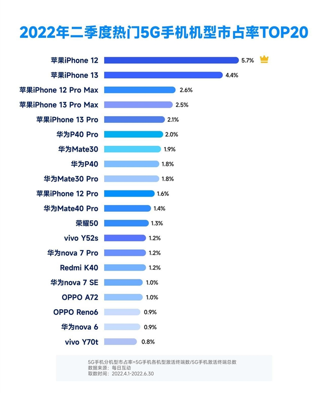 每日互动公布的《2022年二季度5G手机报告》显示,从2022年二季度热门5G手机市占率TOP20排名情况看,国内热门5G手机机型依然以经典机型为主。