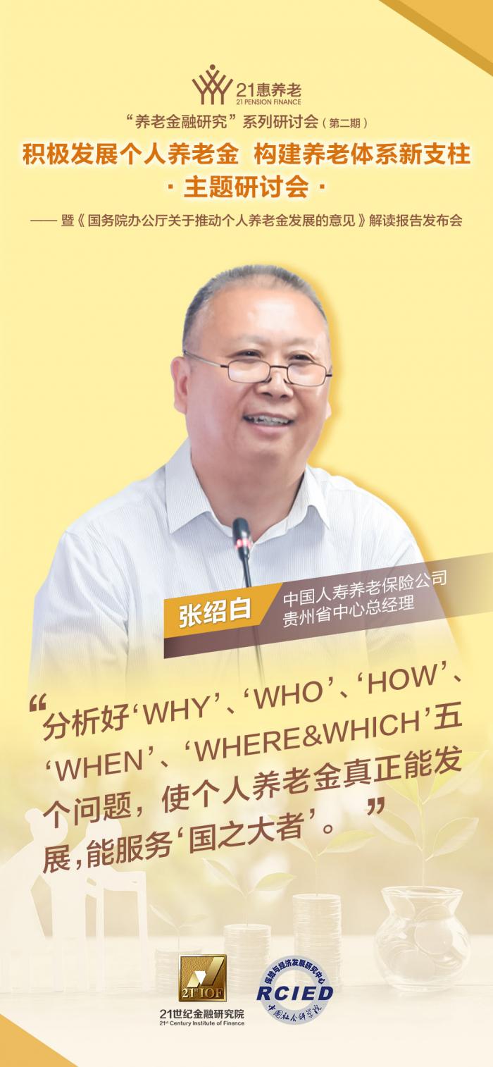 8月19日,由21世纪金融研究院与中国社会科学院保险与经济发展研究中心共同举办的“积极发展个人养老金,构建养老体系新支柱”主题研讨会在京召开。作为一名长期在养老保险领域的思考者和实践者,中国人寿养老保险公司贵州省中心总经理张绍白此次站在普通民众角度,分析其对第三支柱个人养老金的观点。