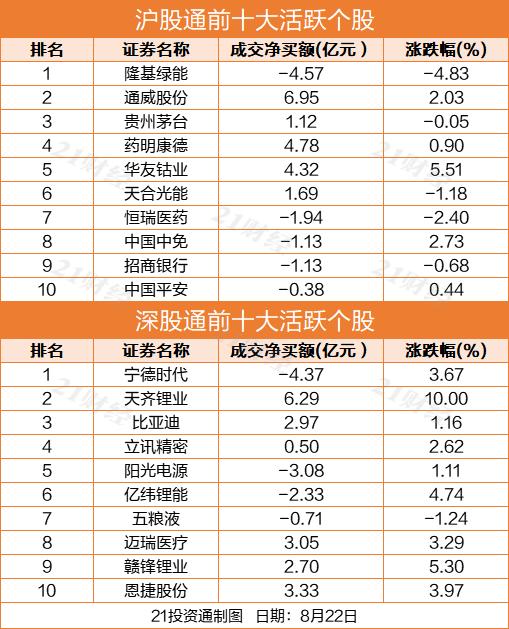 十大活跃个股方面,通威股份(600438.SH)、天齐锂业(002466.SZ)、药明康德(603259.SH)获净买入居前,金额分别为6.95亿元、6.29亿元、4.78亿元。