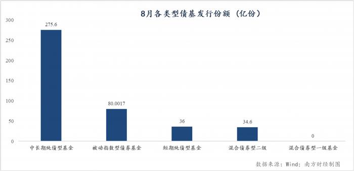 而从具体发行品种来看,发行份额排名第一的为中长期纯债基金共募集275.6亿份,指数型债基募集80亿份,远超7月份的13亿份,另外短债和二级债基8月以来也均发行超30亿份。