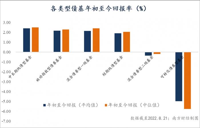 进一步来看,在各类债券基金中,纯债基的业绩表现较为稳定。据Wind数据统计,年初至今,纯债基金以2.29%的平均收益率拿下债基类收益榜第一名,其中,中长期债基平均收益为2.39%,短债基金为1.91%;被动指数型债基平均收益率2.15%;其次是混合一级基金2.15%,而受到权益市场调整影响,混合二级债基、可转换债基类平均收益均为负。