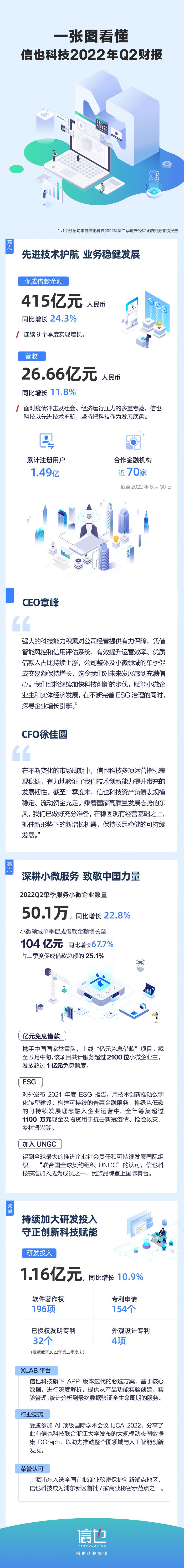 面对疫情冲击及社会、经济运行压力的多重考验,信也科技以先进技术护航,坚持把科技作为发展底盘。财报数据显示,信也科技2022年二季度促成借款金额415亿元,同比增长24.3%,实现了连续9个季度的增长;二季度营收26.66亿元,同比增长11.8%。截至2022年6月30日,信也科技累计对接近70家持牌金融机构,累计注册用户数达1.49亿。