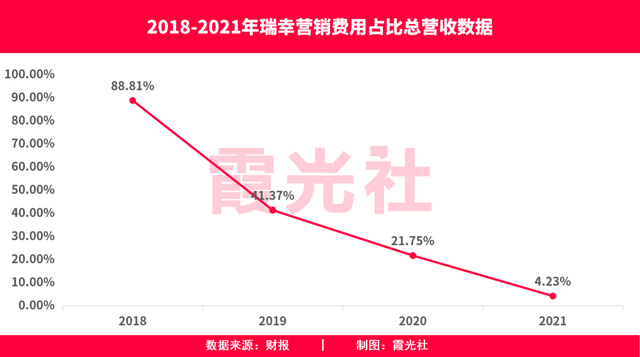 2019年开始,瑞幸的营销费用在总营收中的占比迅速下滑,到2021年底,该费用比例仅为4.23%。