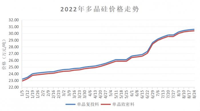 同日,8月24日,中国有色金属工业协会硅业分会最新的报价显示,多晶硅料价格仍在上涨,已是年内第二十八涨。