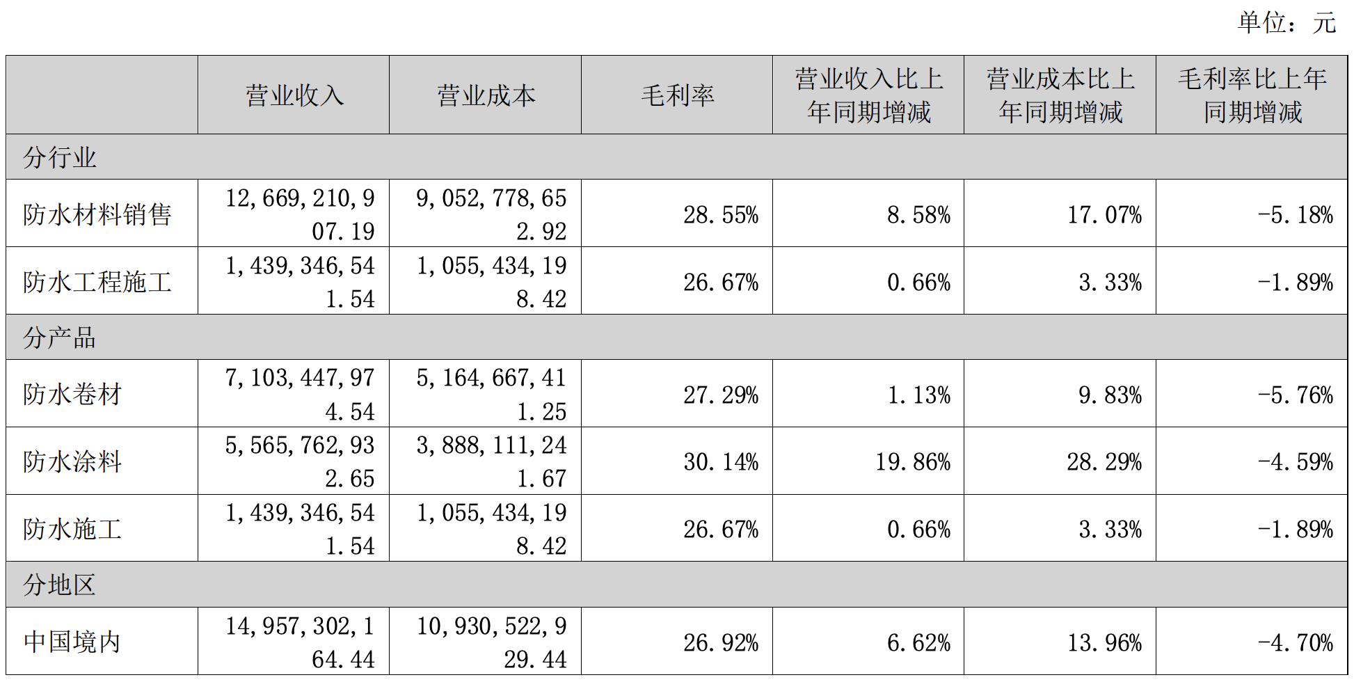 若按照产品来看,虽然防水卷材仍为主力产品实现了71.03亿元营业收入,但防水涂料逐步发力,营收同比上涨19.86%,至55.66亿元,但营业成本却同比增长28.29%。